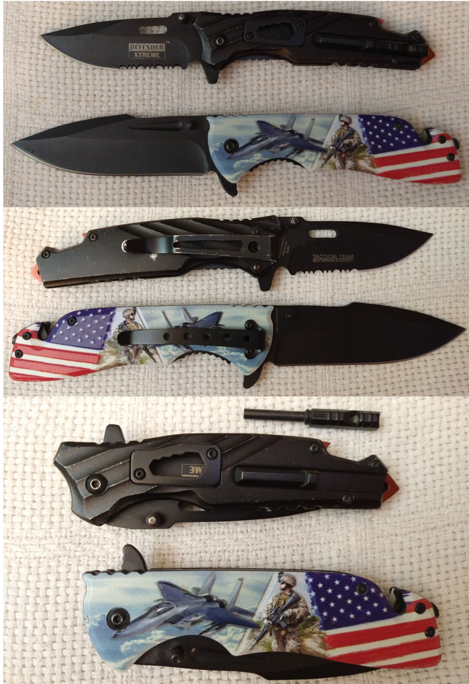 Cool spring assisted knives, one has a little ferro rod for fires, the other is motivating.